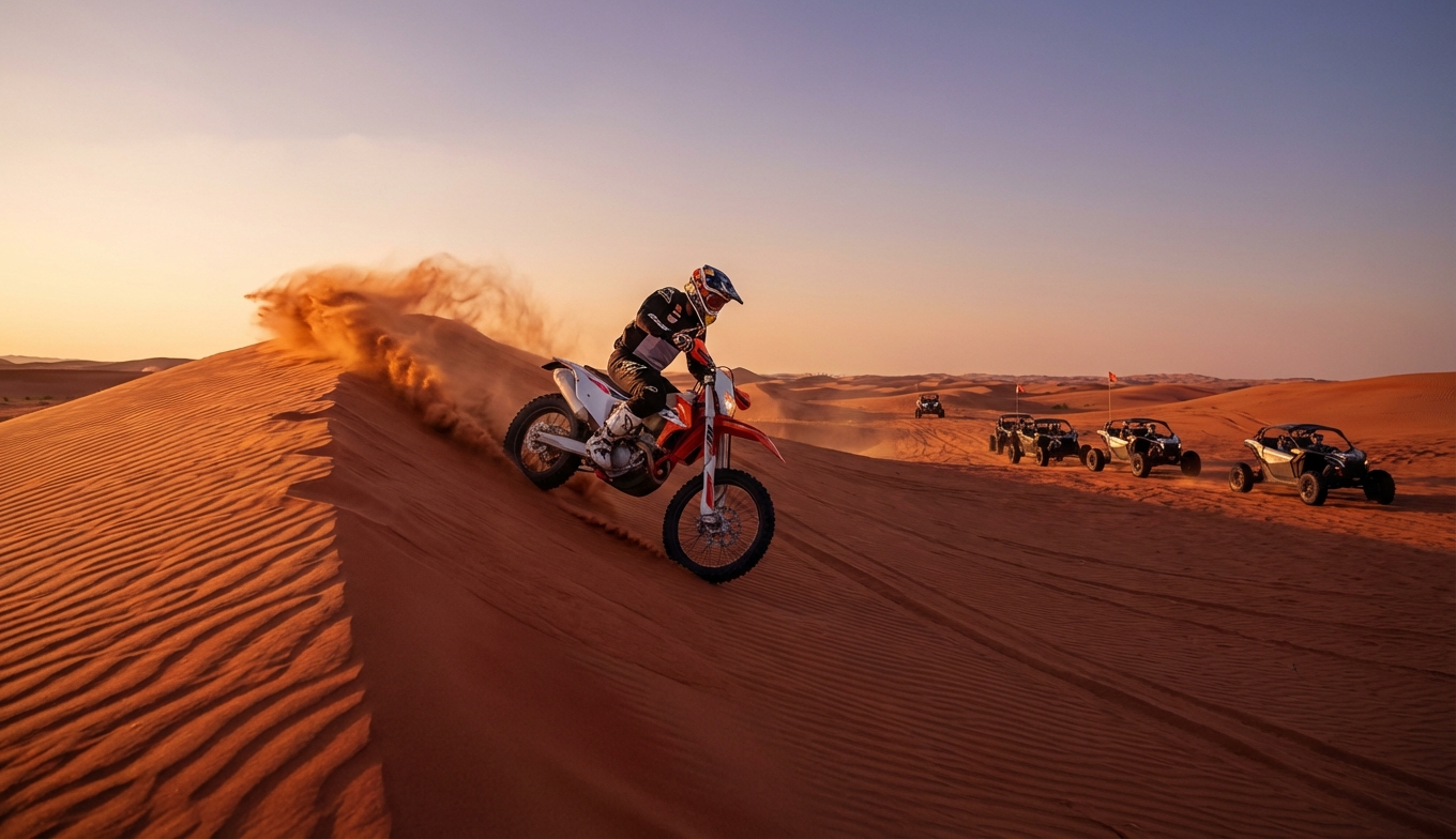 | Mixed Dirt Bike plus Dune Bashing | Private SUV | 4.5–5.5 hrs | Rider plus family | AED 1,600–2,400 total |