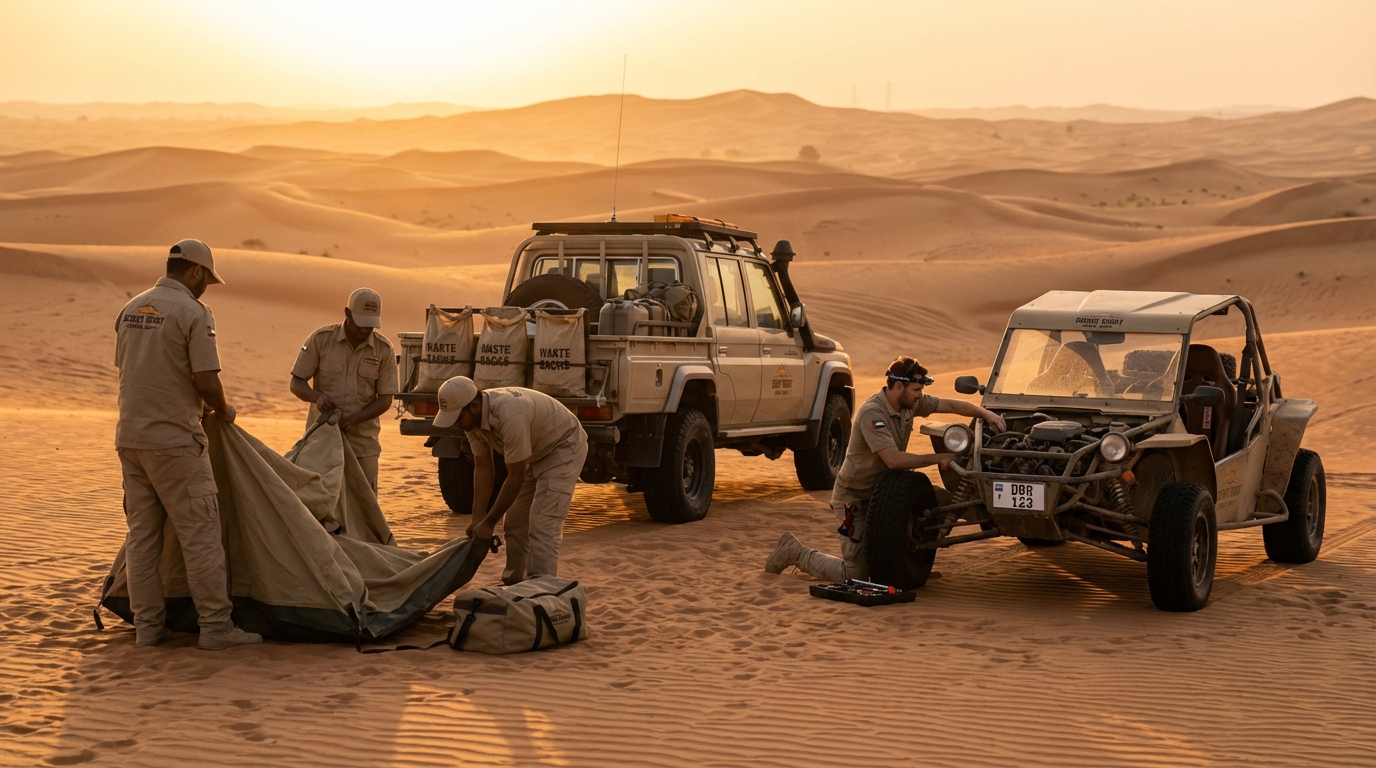 When your Desert Safari Sharjah day ends—whether you took a Morning Desert Safari, an evening Dune Buggy Tour or a family-friendly Desert BBQ Dinner—teams begin a quick but thorough cleanup routine. You’ll see crews collect food waste, pack furnishings, check lost-and-found items and secure vehicles for recovery. Operators like Desert Buggy Rental Dubai include cleanup responsibilities in staff roles and list pickup and return times on your voucher so you know when the crew will begin clearing the site.