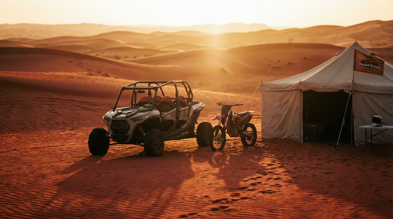 - 🔸 Services: Dune Buggy Tours, Quad Biking, Dirt Bike Dubai sessions, Desert BBQ, Camel Ride, Sand-boarding, Private Camps & VIP Seating.