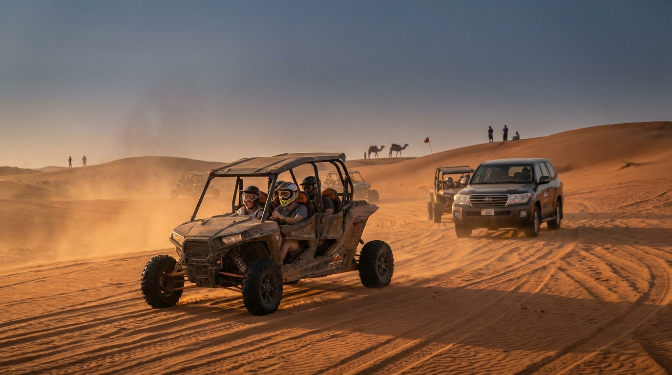 VIP seating or private camps, extended drive time, Camel Ride, sand-boarding, pro photography, and GoPro mounts. Mix buggies and quads if your group has different comfort levels.