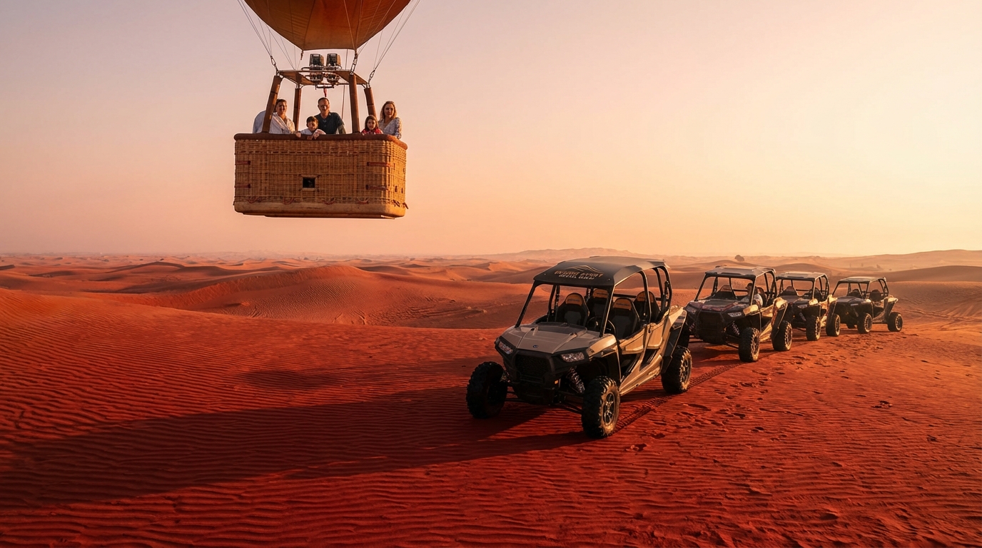 Booking the right Hot Air Balloon Dubai experience in 2026 is a function of timing, launch field choice and the small upgrades you add at checkout. For the best family experience: book shared seats 7–14 days ahead on weekdays or 14–30 days for weekend sunrise slots; reserve private baskets 30–60+ days in advance for peak dates; always provide exact heights in centimetres and request boosters if any child is under 120 cm. Desert Buggy Rental Dubai offers 24 hours booking support, pickups across Al Marmoom, Lahbab Red Dunes, Dubai, Sharjah, Abu Dhabi and Ras Al Khaimah, and a full range of services including Dune Buggy Tours, Quad Biking Tours, Morning and Evening Desert Safari Tours, Desert BBQ Dinner, Camel Ride, Sand-boarding, Private Camps, VIP Seating and Corporate Events. Visit Desert Buggy Rental Dubai to secure your voucher and ask about private baskets and boosters.